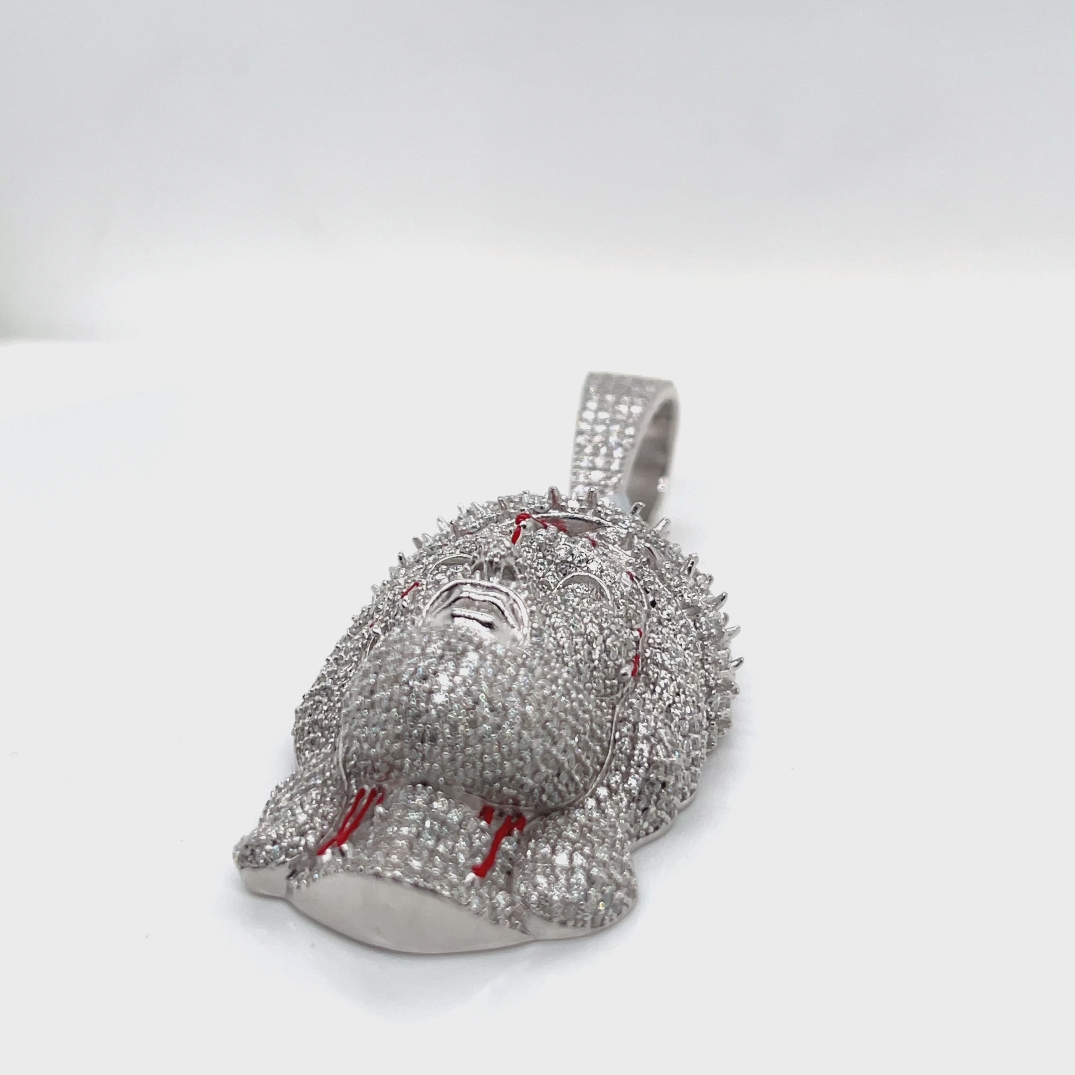 The pendant features a meticulously detailed depiction of Jesus Christ, crowned with thorns and showing the wounds of crucifixion. The lifelike design captures the profound sacrifice and love, with moissanite stones adding a touch of divine brilliance and emotional depth.