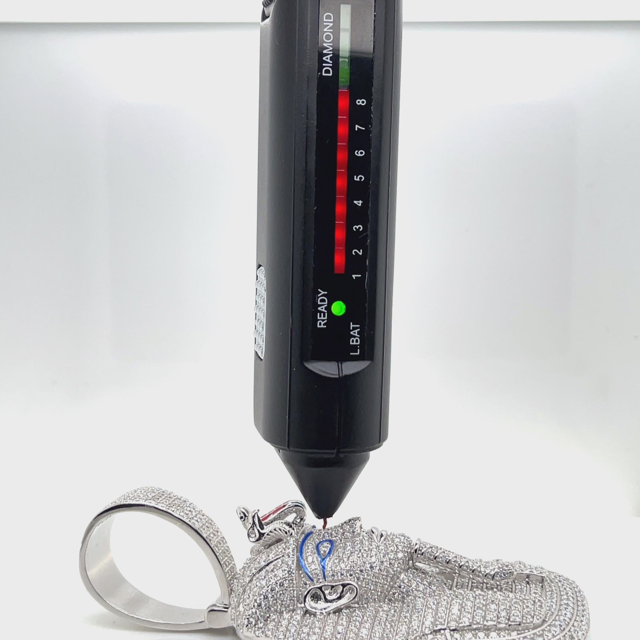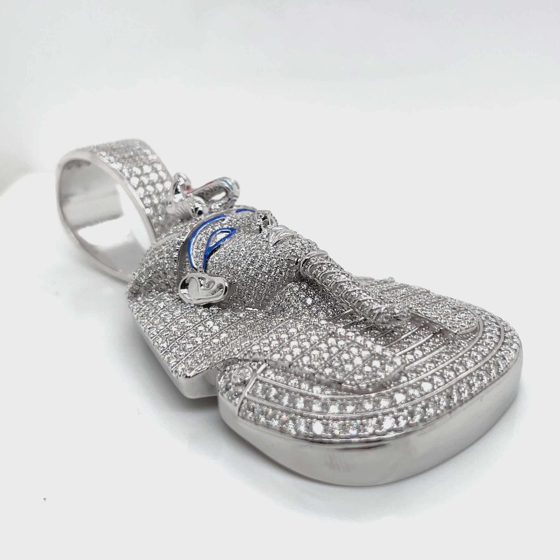 The pendant features a finely detailed Pharaoh figure, symbolizing mystery and timelessness. The Pharaoh is encrusted with moissanite stones, creating a shimmering effect that captivates the eye.