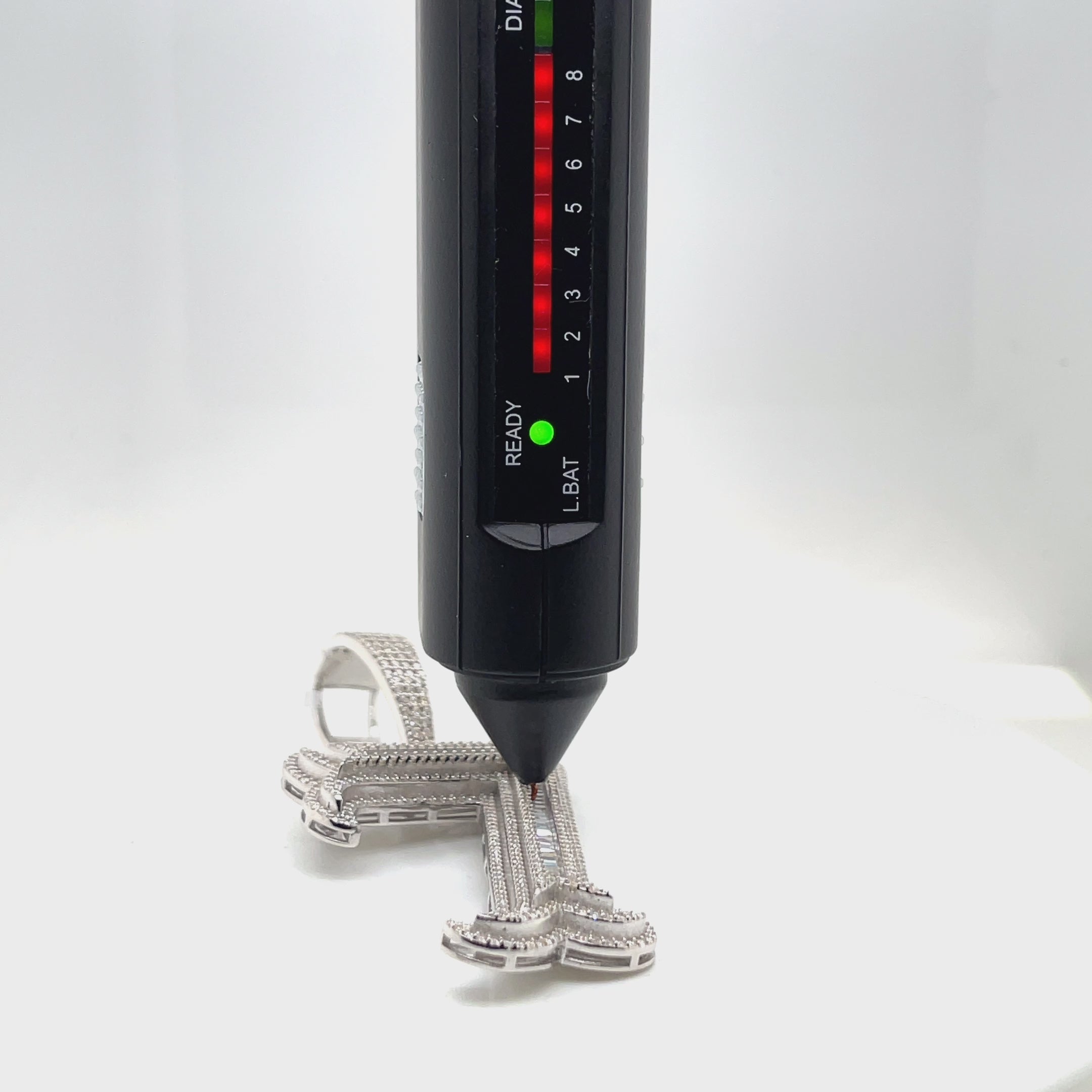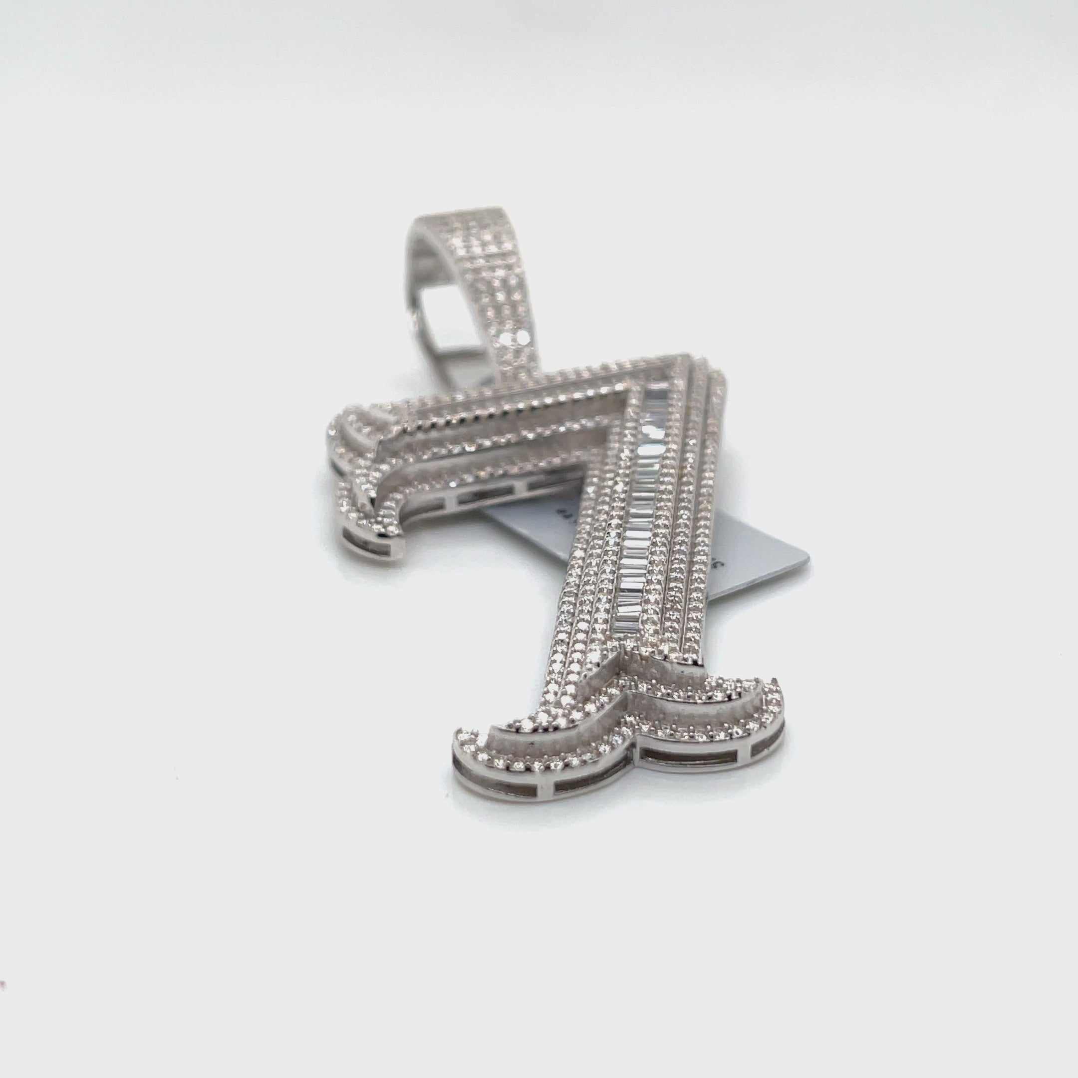The pendant showcases a beautifully crafted number seven, symbolizing luck and perfection. The sleek and sophisticated design is encrusted with moissanite stones, creating a shimmering effect that enhances its visual appeal.