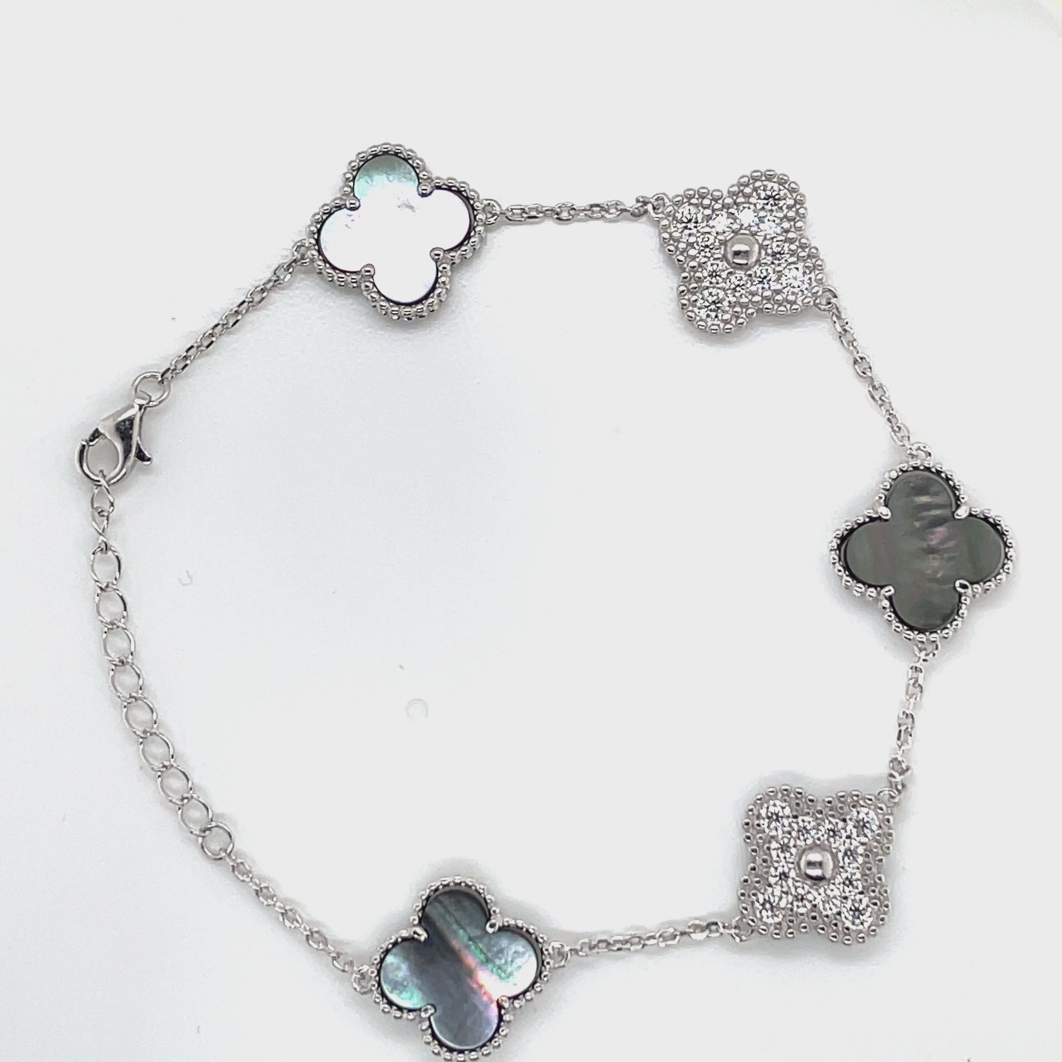 Silver Black Mother of Pearl and Moissanite Clover Bracelet