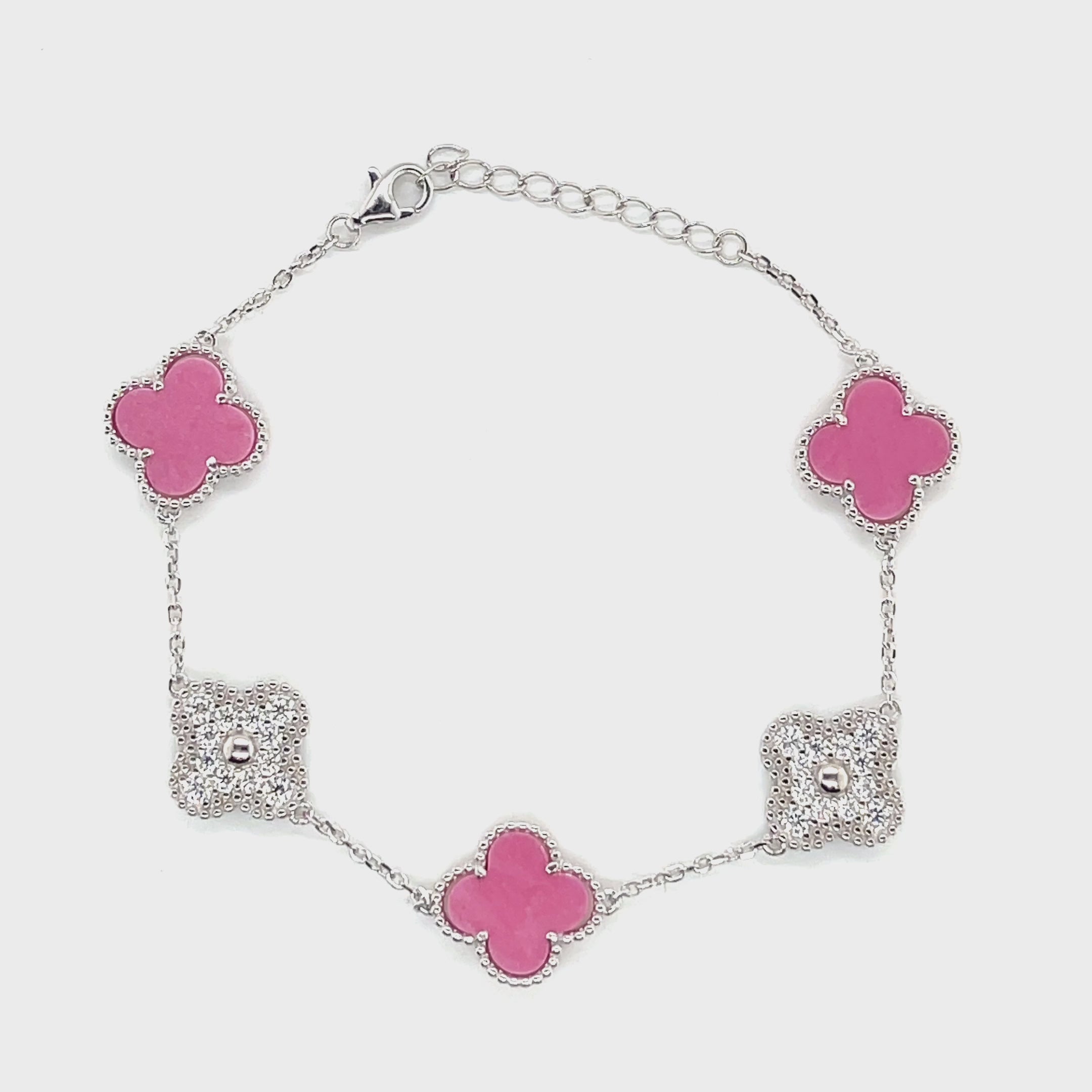 Embrace the elegance of nature with our Silver Pink and Moissanite Clover Bracelet, a stunning addition to the Colosseum Jewelry collection. This exquisite piece features a delicate clover design adorned with shimmering moissanite stones, symbolizing luck and serenity.